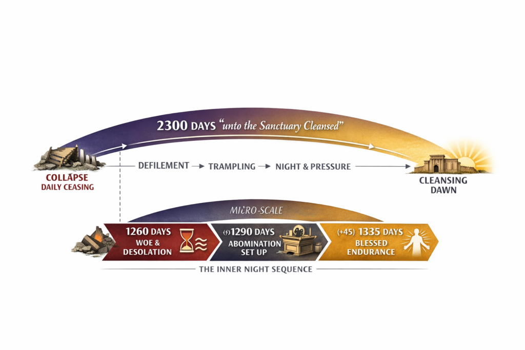 The 2300 describes the full covenant night from collapse to cleansing, while the 1260 → 1290 → 1335 markers describe the inner progression of that night: the three‑woe desolation (1260), the 30‑day hardening that sets up the abomination (1290), and the endurance that carries the believer to dawn and blessedness (1335). The numbers are not mathematical fractions of one another; they are pictographic markers within the same covenant movement, each expressing a symbolic stage in God’s redemptive work.